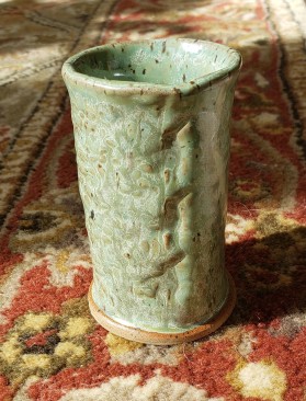 Hand built Floral Texture Vase with soft green glaze. This vase was hand built using Speckled Brownstone Clay and glazed with Green Tea. This vase was created by hand as an individual piece of art. Approximate size: Height 3.75" x Diameter 2.5". Hand built.